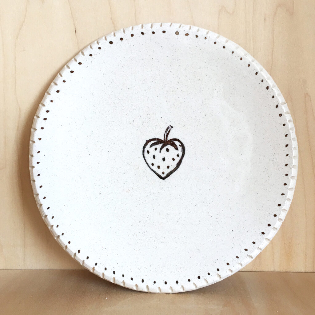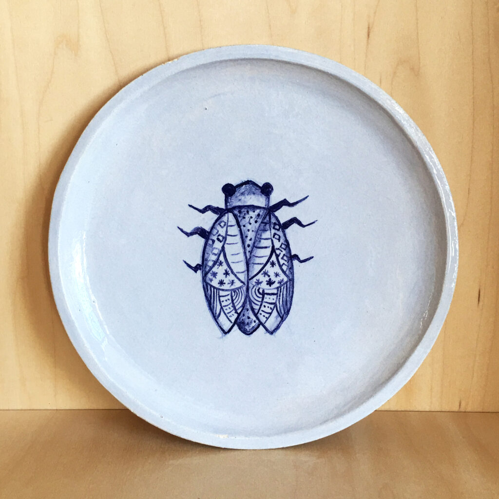 Assiette lavande illustrée avec de l’or – GrèsAssiette fraise illustrée avec de l’or – GrèsDétail assiette cigale illustrée or – GrèsAssiette cigale illustrée bleu et or – GrèsAssiette cigale illustrée bleue – Grès